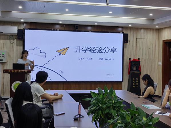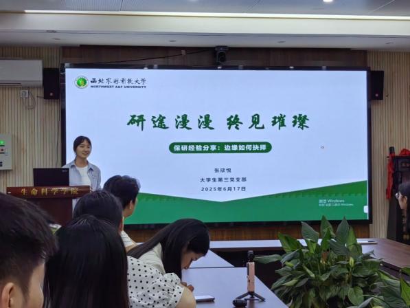 会议伊始,毕业生党员开展保研、考公、留学的经验分享环节,分享者倾囊相授,就自身在学习规划、院校选择、复习技巧等方面,全面详尽的为大家进行分享,以真诚与智慧为学弟学妹们点亮前行灯塔。同时,他们力争上游,克服困难坚持到底的精神,也为成员们带来了精神的鼓舞。