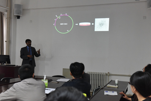 Venugopal Nair在分析长时间跨度马立克病毒主要致病株时发现,长期使用疫苗导致马立克病毒致病性增强。这种增强是因为在免疫压力下,强毒有更多的逃逸机会,进而在病毒群体中占据主导地位。Venugopal Nair的发现促使人们重新考虑动物免疫策略,即如何在长期免疫过程中避免强毒株的出现。Venugopal Nair的报告使我院师生接触到了免疫学领域的前沿研究进展,开阔了学术思维,与会师生受益匪浅。