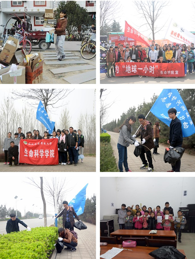 3月15日,生命学院组织志愿者在学生公寓区举办了废品回收义卖活动,收集废品近百斤,义卖所得款项全部用来完成“青春驿站”的小朋友的微心愿,活动呼吁青年践行雷锋精神,用爱关怀他人。3月19日,举行了“地球一小时”宣讲活动,其中包括了签字仪式、发放荧光棒、记录熄灯宣言等系列小活动,吸引了不少过往学生的加入,呼吁青年从自身做起,改善环境状况,保护我们的蓝色家园。3月21日,与杨凌水务局在渭河举办了“维护河堤健康,志愿者在行动”活动,活动中志愿者们沿着渭河河堤协助水务局的工作人员清理垃圾,呼吁更多的人加入到维护河堤健康的队伍中来,用青春还渭河清绿。3月22日“世界水日”,联合杨凌水务局举行了“树节水之风,倡勤俭之德”的签字宣讲活动,杨凌水务局局长蒋选儒也来到了现场,对志愿者的作为表示高度肯定,活动呼吁青年践行节水之约,强化“节水、惜水、爱水”意识。3月31日,学生志愿者义务清扫了教学楼和我校东南社区,并前往杨凌第二高新小学进行支教,为小学生们开展了安全教育。