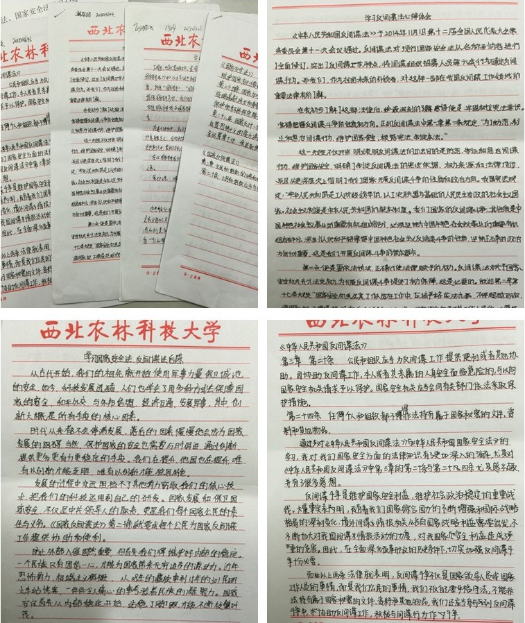 自4月5日起,学院组织全院学生进行手抄《中华人民共和国国家安全法》和《中华人民共和国反间谍法》活动,活动要求每位学生首先自学“两法”,通过学习后摘抄重点章节。这个方式在学生群体中反响热烈,同学们争先恐后地将自己的“作品”晒到班级的QQ群、微信群中“一决高下”。