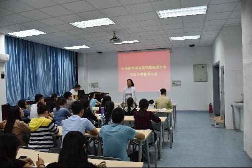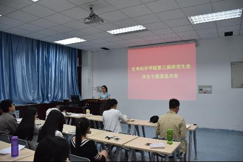 2016年5月19日晚8点在理科楼B111隆重举行了生命科学学院第三届研究生会干部换届选举大会。研究生辅导员康乐老师和第一届研究生会主席李核同学以及包括第二届研会主席李彦在内的2014级全体研会干部担任了此次大会的嘉宾。除了研究生会2014级和2015级所有干部外,生命科学学院2015级研究生各班班长、团支书以及学生代表也参加了此次大会。会议由研会副主席黄婷主持。
