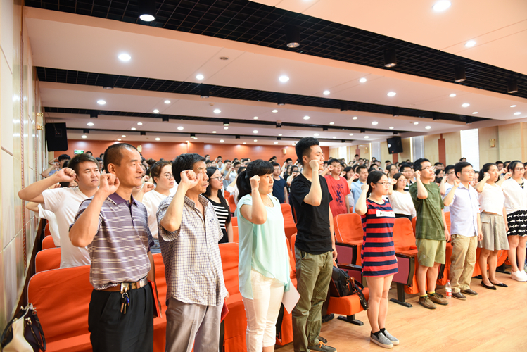 在入党宣誓环节,新发展的44名预备党员在领誓人的带领下面对党旗庄严宣誓,210多名毕业生和其他党员重温入党誓词。