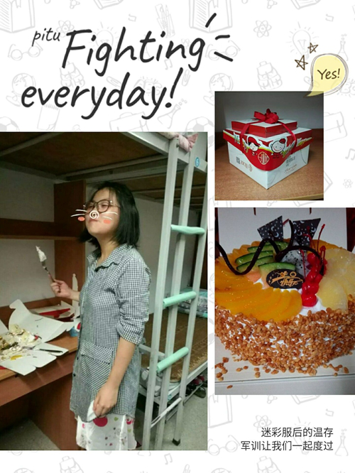 1606班祁雨萌同学在军训中的这一天迎来了她的十八岁生日,得知这件事的16级辅导员陈悦和班助董晴玉,贴心的为雨萌准备着惊喜。完成一天军训任务,拖着疲惫身体回来的她,发现了放在门口的生日蛋糕,辅导员、班助和新同学们一起为她庆祝十八岁生日,参加这特殊的成人礼。祁雨萌说道:“其实,过十八岁生日,除了开心还有忧伤。十八岁意味着更多的责任与挑战,但是我也庆幸自己拥有这样一个特殊的成人礼,军训的生活,军人的作风,战友的关心,意志的磨练都将成为我宝贵的成人礼礼物,伴随我坚定地走向未来的路。”